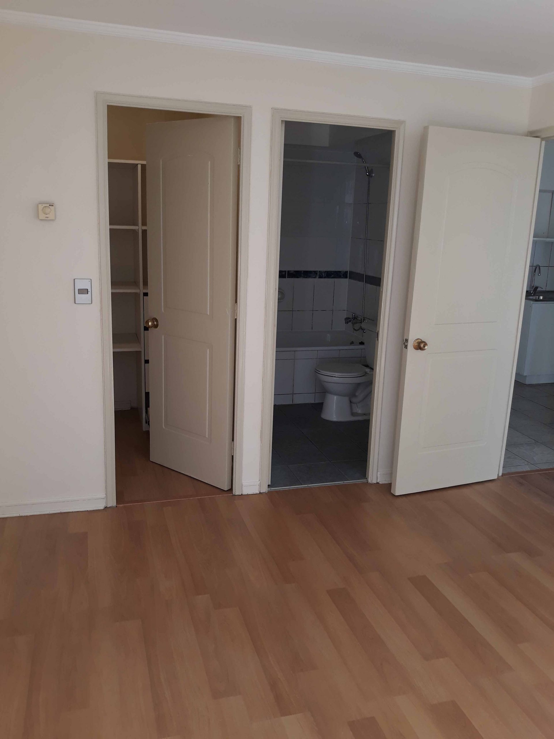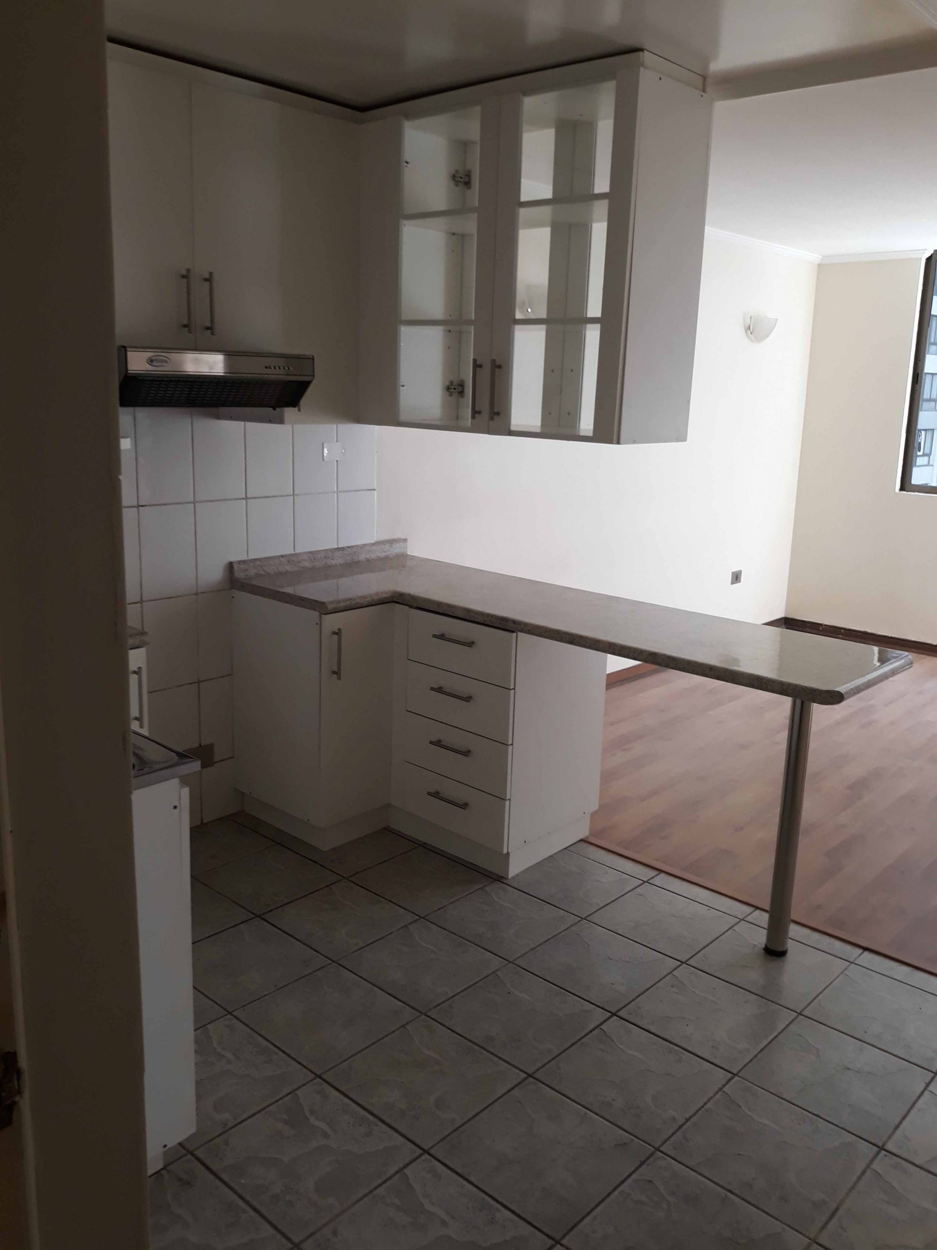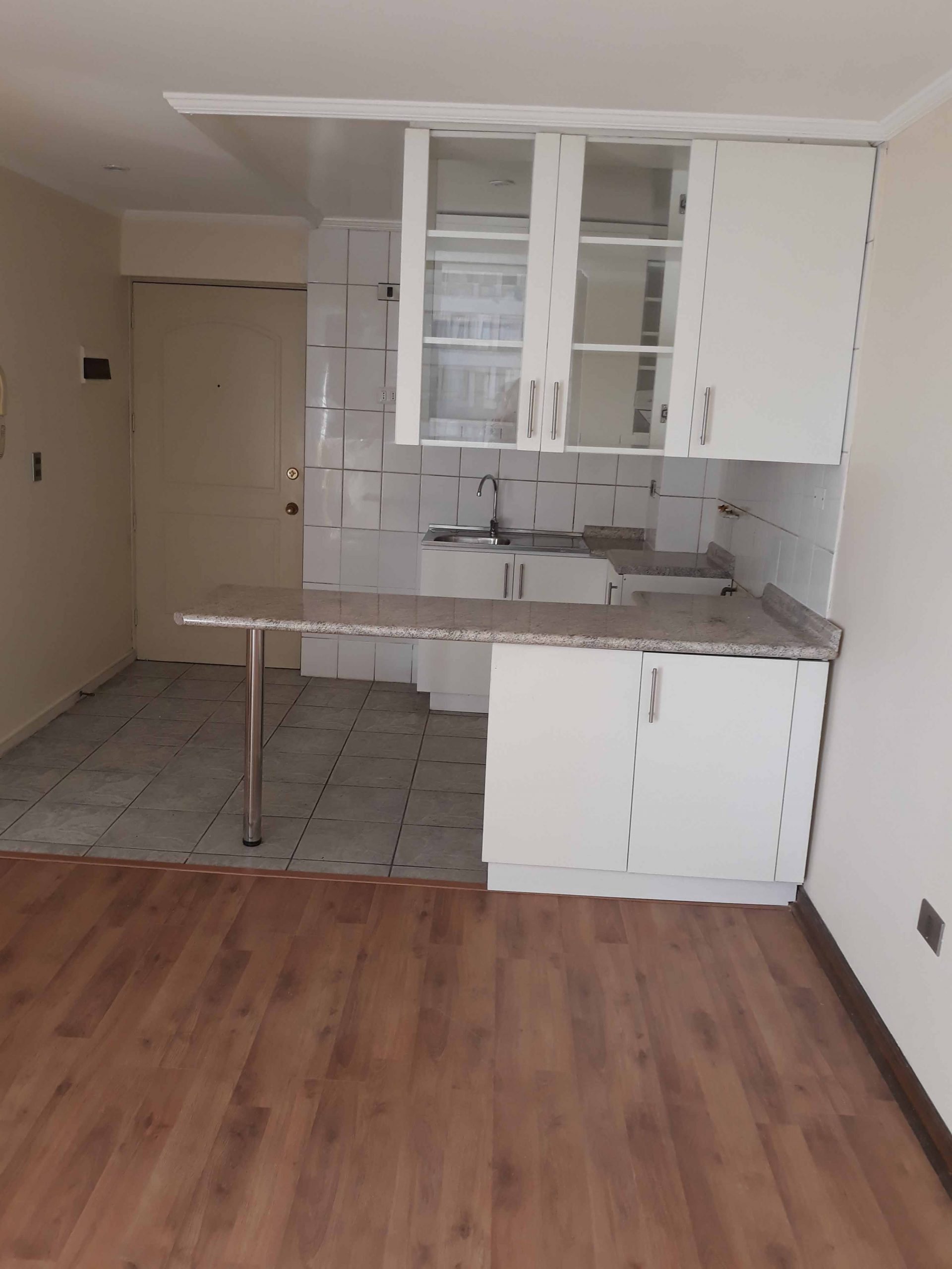 Living, cocina americana, un dormitorio, walk in closet, baño, piso flotante, estacionamiento y bodega.